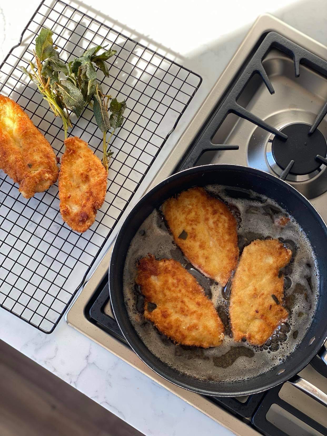 Byrjað er á að skera bringurnar þvert á lengdina (til þess að þynna þær og fá 4 bita). Síðan er gott að berja þær niður til þess að fá þær extra þunnar. Síðan er bringunum velt upp úr hveitinu, síðan eggjunum og svo raspinum. Síðan er sett olía í pönnu, botnfylli (ca 1-2 cm upp pottinn) af olíu. Byrjað er að setja hvítlaukinn í og svo salvíuna. Síðan er kjúklingurinn settur í olíuna og steiktur þar til hann fær fallegann lit.