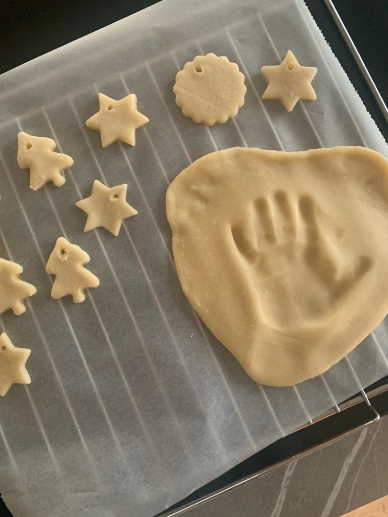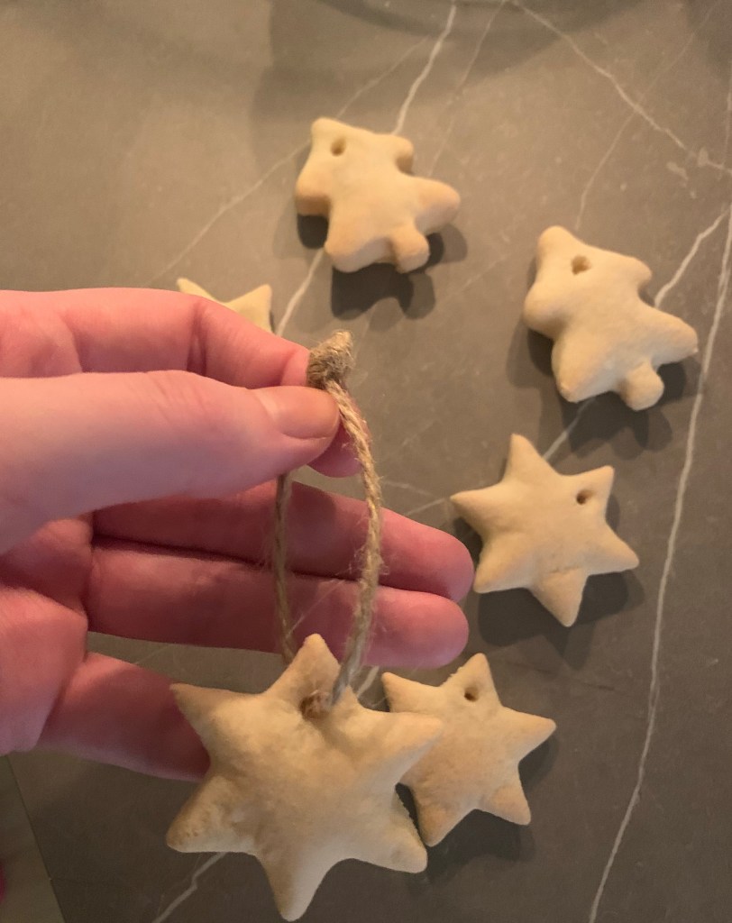 Við Emma vorum veikar heima saman í gær. Heimilið var í rúst eftir að Emma var búin að vera heima í nokkra daga og þar af leiðandi var allt í dóti og drasli. Ég mútaði henni í smá með Peppa Pig og náði að ganga frá aðeins til þess að hafa huggulegt. Síðan horfðum við saman á jólamynd og höfðum kósí. Emma var orðin mjög óróleg eftir mikla inniveru og er öll að hressast og þ.a.l. mikil orka svo mér datt í hug að gera með henni tröllaleir sem sló svo sannarlega í gegn. Ég leyfði henni að brasa með helminginn og gerði svo sjálf jólaskraut úr restinni. Ég notaði piparkökuform sem ég átti og stakk svo gat í gegn efst til þess að geta komið bandi í gegn. Svo ætla ég að nota þetta á jólapakkana í ár. Bandið er úr Ikea en svona jute band fæst á mörgum stöðum.