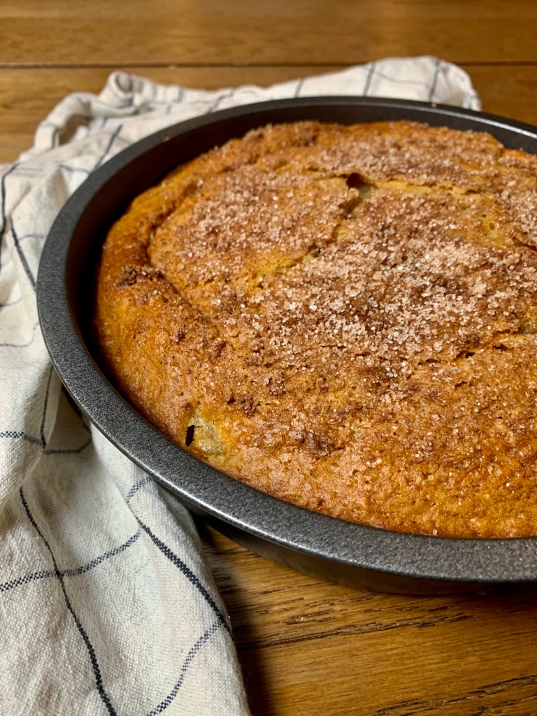 Byrjað er á að skera eplin í litla bita. Sykrinum og kanil er blandað saman og hellt yfir eplabitana og hrært því saman svo öll eplin séu þakin kanilsykri. Þetta er sett til hliðar og þurrefnin sett saman í skál. Eggjum, eplamauki, smjöri og vanilludropum er bætt saman við þurrefnin og hrært, mikilvægt er að hræra ekki meira en þarf. Hrærið eplunum svo samanvið deigið með sleif. Skiptið deiginu í tvö smurð form og bakið við 175° í 45-60 mínútur. Ég stráði kanilsykri yfir deigið í forminu áður en þau fóru í ofninn.