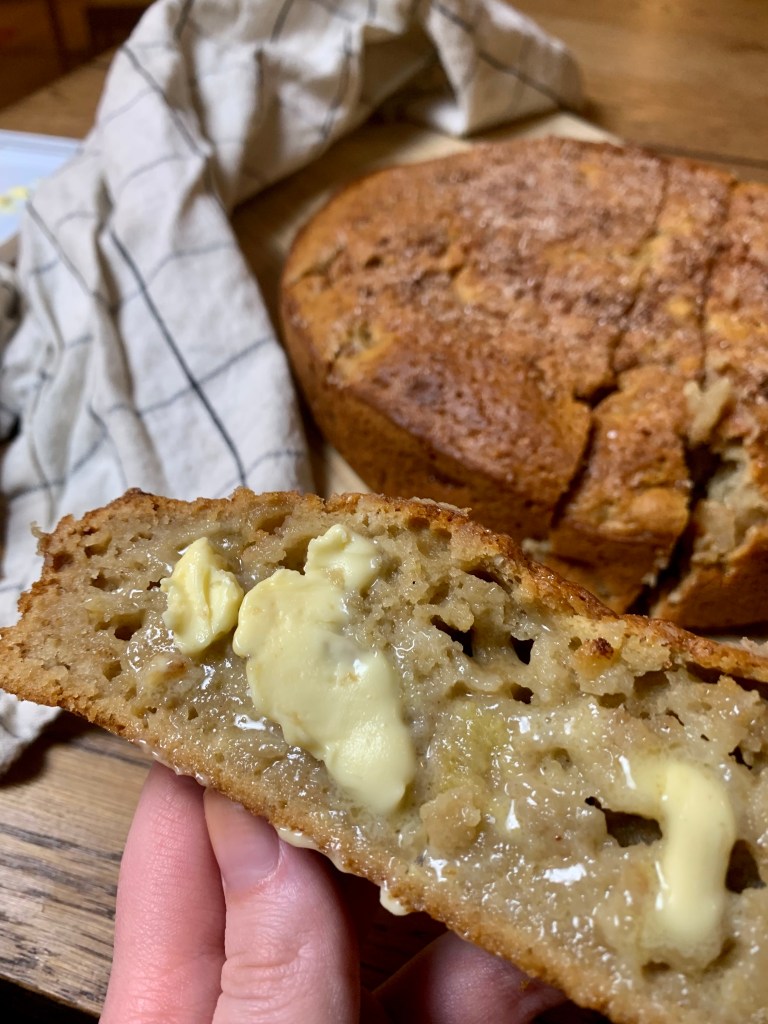 Ég elska bananabrauð. Ég man svo eftir því að koma heim þegar ég var lítil eftir að hafa verið úti allt kvöldið og mamma var búin að baka bananabrauð. Ég sá um daginn uppskrift af eplabrauði. Ég hafði aldrei heyrt um svoleiðis áður og ákvað ég að prófa að baka það, breyta smá til frá bananabrauði. Þetta brauð kom ótrúlega á óvart og Emma stóð á beit! Emma borðaði það eintómt en ég smurði það með smjöri, namm hvað það var gott. Ég tók eftir því þegar ég ætlaði að baka brauðið að ég er búin að týna brauðforminu mínu. Ég verð að finna þau eða kaupa mér ný. Eldhúsið ilmaði svo vel eftir að ég tók brauðin út, það var ekki verra! Uppskriftin gefur tvö brauð.