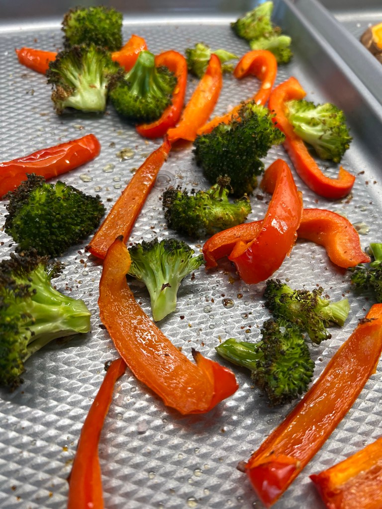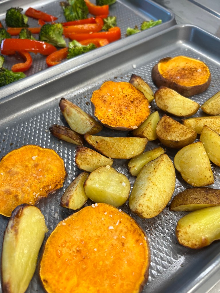Ég skellti sætukartöflunum og kartöflunum saman í fat með olíu og eldaði í ofni, ég kryddaði þær með salti, pipar og paprikukryddi. Ég setti svo paprikurnar og brokkolí í annað fat og skellti smá olíu yfir og kryddaði með salti og pipar og eldaði líka í ofni. Ég sauð vatn í hraðsuðukatli og hellti út á kúskúsið eftir leiðbeiningum. Ég setti kjúklingatening, salt og pipar út í kúskúsið fyrst. Ég hitaði svo nokkrar grænmetisbollur sem ég átti í frystinum og hafði með. Ég raðaði þessu öllu svo í skál og þá var þetta tilbúið.
