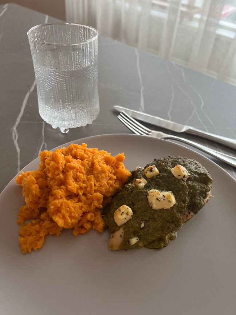 Berið fram kjúklinginn fram með sætkartöflumúsinni.