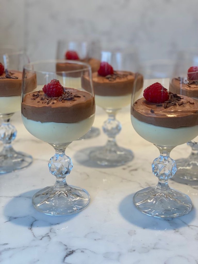 Byrjað er á að bræða hvíta súkkulaðið yfir vatnsbaði. Þeytið saman helminginn af rjómanum, helminginn af sykrinum og eina eggjarauðu. Leyfið hvíta súkkulaðinu aðeins og kólna svo það sé ekki brennandi heitt og blandið því svo varlega saman við rjómablönduna með sleif. Skiptið niður í fjögur glös og leyfið að stífna í ísskáp í klukkustund. Bræðið svo dökka súkkulaðið yfir vatnsbaði og endurtakið rjómablönduna nema bætið í þetta skipti Baileys líka út í rjómann. Þegar súkkulaðið hefur aðeins fengið að kólna er súkkulaðinu varlega hellt saman við rjómablönduna og hrært saman með sleif. Setjið ofaná hvítu súkkulaðimúsina og leyfið að stífna aftur í ísskáp. Skreytið með hindberjum og njótið.