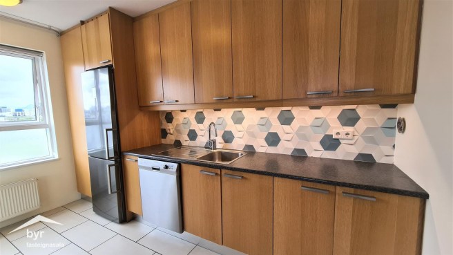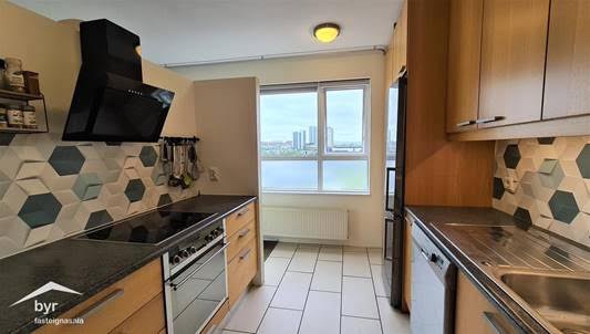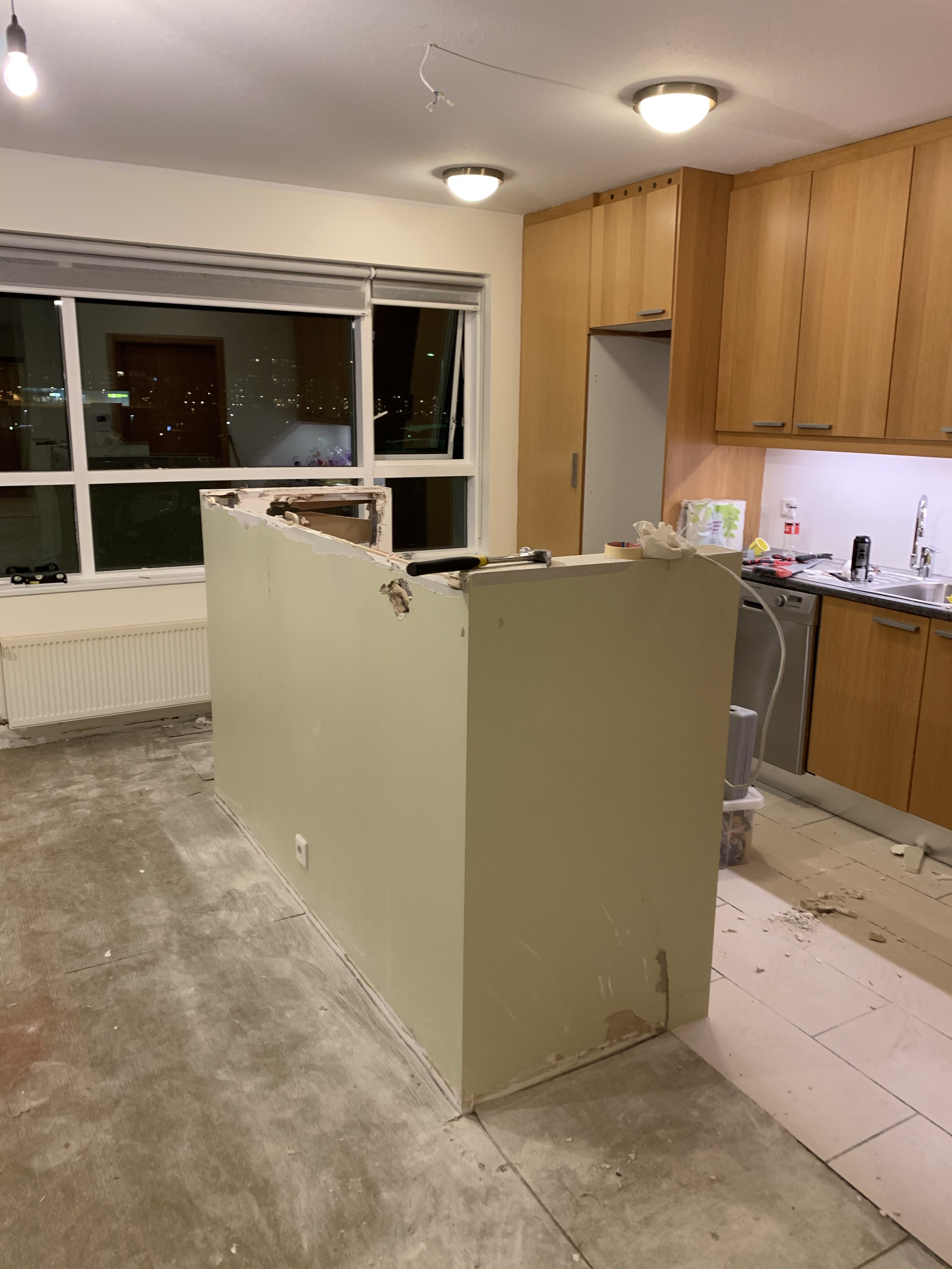 Núna erum við búin að græja nánast allt sem var ofar á listanum í framkvæmdum og það sem við þurftum að kaupa svo það má fara að huga að eldhúsinu. Ég var fyrst að spá í að kaupa bara nýtt eldhús en mér finnst eiginlega synd að gera það þegar ekkert er að innréttingunni og hún er sérsmíðuð hingað inn. Ég er því að spá í að láta sprauta hana, skipta um borðplötu, höldur og setja fallegar flísar á milli efri skápa. Þegar við fluttum inn þá var eldhúsið stúkað af með vegg sem við tókum niður og settum nýja stóra borðplötu yfir svo hægt væri að sitja við eyjuna. Ég væri til í að hafa eins borðplötur báðum megin en ekki eins og er núna: ný borðplata á eyjunni og gamla borðplatan ennþá á rest.