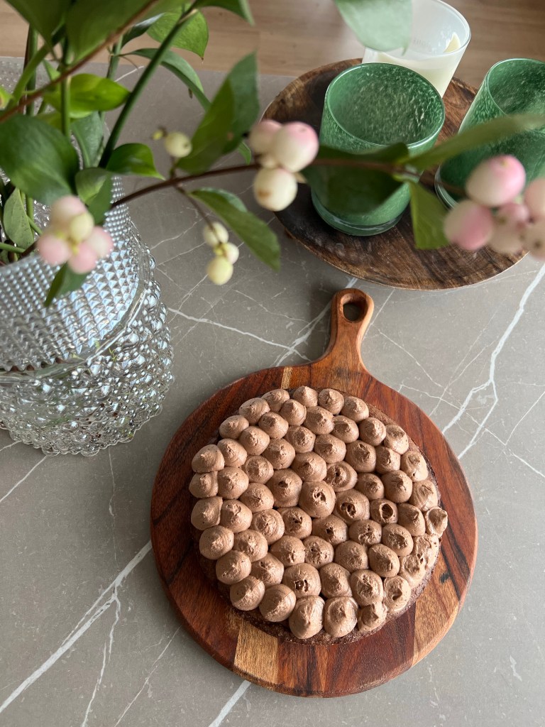 Dreyfið kreminu yfir kökuna þegar hún hefur kólnað, ég notaði sprautupoka og klippti neðan af honum og sprautaði á litlar kúlur.