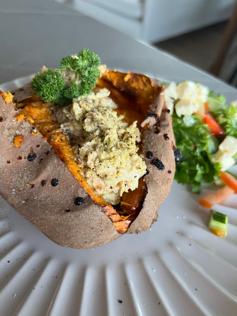 Byrjið á því að hita ofninn í 200°. Stingið göt í hýðið á sætu kartöflunum með gaffli og setjið inn í ofn þar til þær eru mjúkar í gegn, það tekur um 50 mín. Hellið smá ólífuolíu yfir kjúklinginn og kryddið eftir smekk með paprikukryddi, hvítlauksdufti og pipar. Setjið kjúklinginn inn í ofn þar til hann er eldaður í gegn, ca 25-30 mín. Þegar kjúklingurinn er fulleldaður er hann tættur með tveimur göfflum og rjómaostinum og pestóinu blandað saman við, byrjið á 1 msk af hvoru og bætið við ef þarf. Skerið þvert yfir sætu kartöfluna og opnið hana. Fyllið sætu kartöfluna af kjúklingafyllingunni og berið fram með salati og fetaosti.