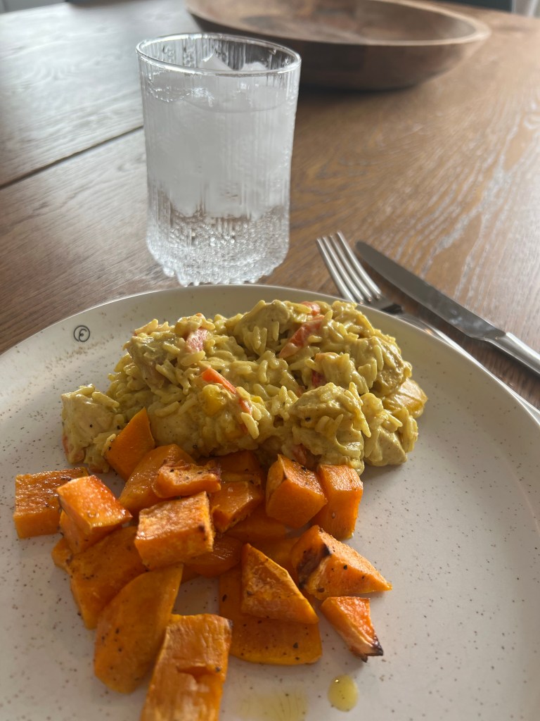 Byrjið á að steikja laukinn, saxaðann, þar til hann er orðinn gegnsær í olíu. Bætið þá við hvítlauknum, smátt söxuðum eða pressuðum og blandið saman við laukinn. Bætið þá kjúklingnum á pönnuna og steikið þar til hann er eldaður á öllum hliðum, bætið þá grænmetinu út á pönnuna, ég setti bara það grænmeti sem ég átti með líka. Bætið síðan kókosmjólkinni út á og kryddunum, teningnum og hrísgrjónunum, hrærið saman og leyfið að malla. Hrærið af og til í svo hrísgrjónin brenni ekki við. Þegar sósan er orðin þykk og hrísgrjónin elduð í gegn þá er rétturinn tilbúinn. Ég bar hann fram með sætum kartöflum sem var mjög gott en alveg hægt að sleppa.