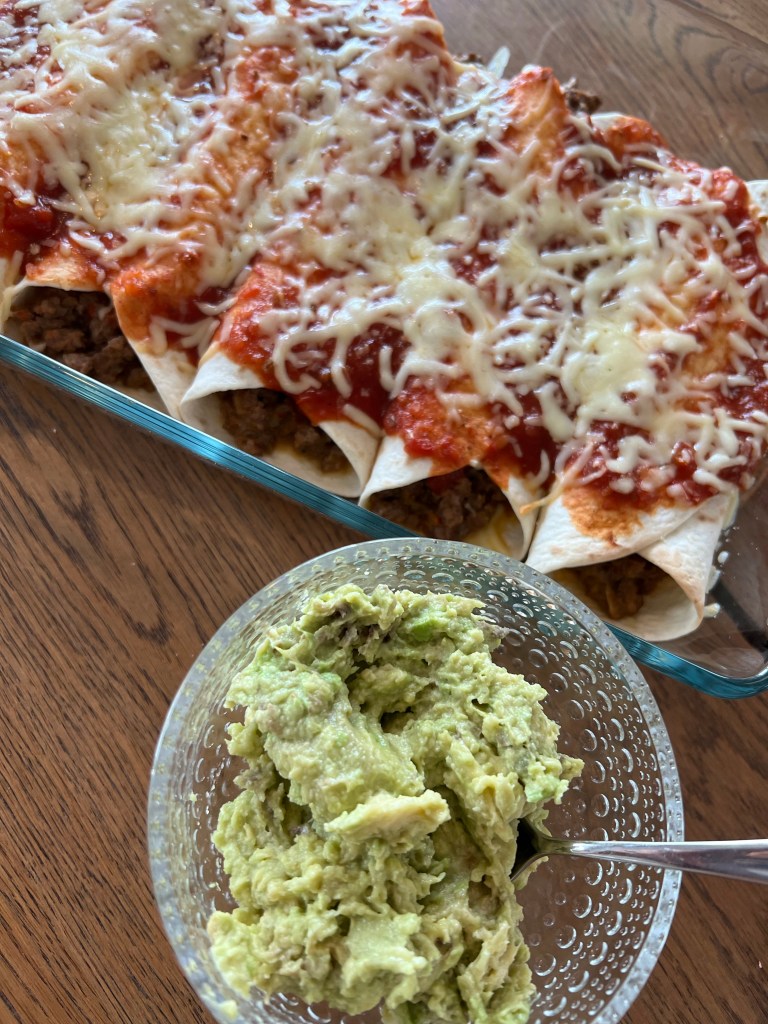 Byrjið á því að skera niður allt grænmetið og steikja það uppúr olíu. Takið grænmetið af pönnunni og setjið í blandara eða maukið með töfrasprota, leyfið aðeins að rjúka úr því fyrst svo blandarinn springi ekki. Steikið hakkið á sömu pönnu. Hellið grænmetismaukinu út á pönnuna ásamt teningnum og kryddið eftir smekk. Hrærið þessu vel saman og leyfið aðeins að malla. Setjið hakkblönduna á tortillurnar og rullið þeim upp. Raðið tortillavefjunum í eldfast mót, toppið þær svo með salsa og rifnum osti. Setjið inn í ofn í 10 mínútur á 180°. Berið fram með avókadó (eða guacamole), sýrðum rjóma og snakki.