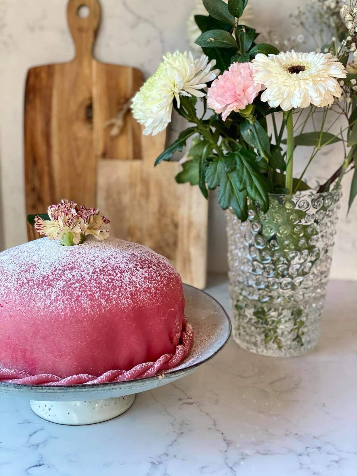 Skerið kökubotninn í 3 lög, semsagt þvert í kökuna svo þær verði þrjár. Setjið fyrsta kökubotninn á kökudisk, smyrjið þykku lagi af sultu á hann allan og kökubotn yfir. Ofaná kökubotninn fer vanillukrem og svo seinasti botninn þar ofaná. Stífþeytið rjómann og smyrjið honum vel yfir efsta botninn, því meira því betra. Dreifið svo þunnu lagi af rjóma í hliðarnar á kökunni. Setjið kökuna í ísskáp til þess að stífna á meðan þið rúllið út marsipani. Það er mjög flott að bæta matarlit saman við marsipanið. Gott er að nota Maizena þegar marsipanið er rúllað út til þess að koma í veg fyrir að það festist við. Setjið marsipanið yfir kökuna (það á að vera ca 3-4 mm á þykktina. Skerið afganginn kringum kökuna af og stráið yfir kökuna flórsykri.