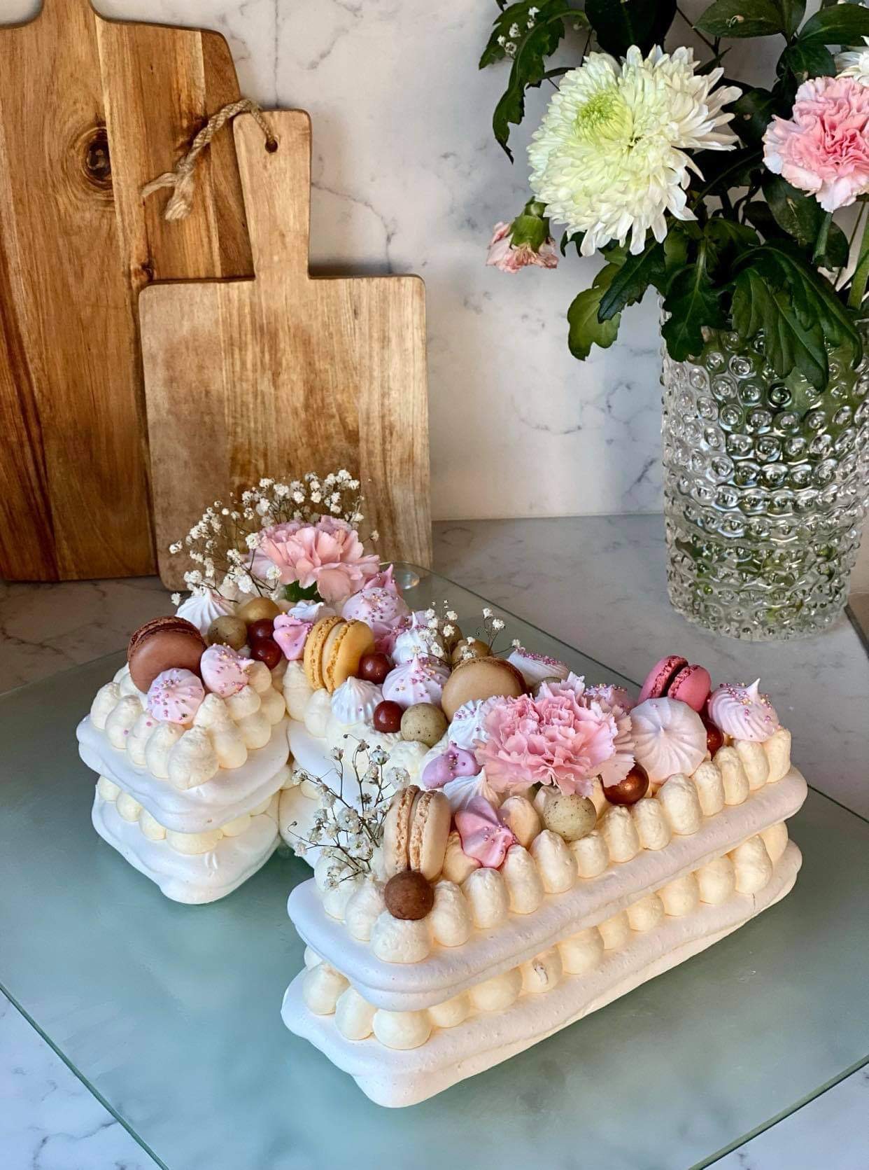 Byrjað er á að hita ofninn í 100° blástur. Síðan er eggjahvítunum og sykrinum bætt í skál og stífþeytt. Ég vildi hafa tvo litla stafi en ekki einn stóran svo ég teiknaði „2“ á bökunarpappír, tvo hlið við hlið. Setti svo stífþeyttu blönduna í sprautupoka og sprautaði eftir stöfunum sem ég hafði teiknað á pappírinn. Ég endurtók þetta fyrir samtals 4 stafi, ég teiknaði á annan bökunarpappír með því að hafa hinn undir og draga eftir sömu línur svo allt yrði alveg eins. Svo bakaði ég þetta inn í ofni í 90 mínútur og slökkti þá á ofninum og leyfði þeim að standa í nokkra klukkutíma. Svo setti ég tvistana hlið við hlið á plötu. Stífþeytti rjóma og blandaði daimkurli saman við. Ég sprautaði rjómanum á stafina og skellti hinum tveim stöfunum ofaná. Ég sprautaði öðru lagi af rjóma ofaná og skreytti síðan með bræddu dumle (bræddi í potti með smá rjómaskvettu), kókosbollum, dumle karamellum og hindberjum.