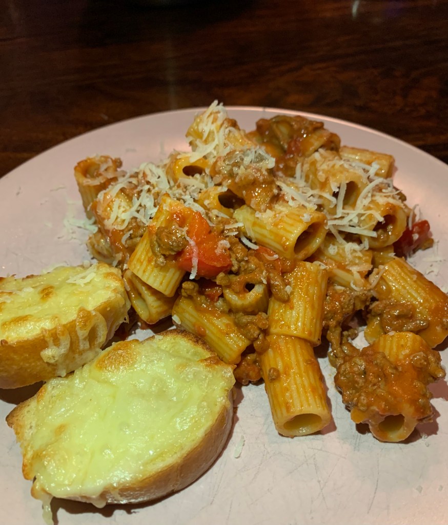 Rigatoni er eitt uppáhalds pastað mitt. Það er mjög vinsælt á suður Ítalíu og heitið er komið frá röndunum sem liggja eftir pastanu sem lætur sósu og ost festast betur við það, annað en slétt pasta gerir. Mér finnst þessi réttur ótrúlega klassískur og er aðeins fínni útgáfa finnst mér af hakk og spagettí. Það er gaman að bera þennan rétt fram því hann er ekki svona týpískur heimilisréttur hér á Íslandi og hann er mjög auðveldur að útbúa. Mér finnst lykillinn að góðri hakksósu vera að leyfa henni að malla lengi við vægan hita. Ég var í heila klukkustund að dunda mér þetta kvöld við að gera hakksósuna. Ég eldaði heima hjá tengdó og náði að smella nokkrum myndum, ég notaði flassið á tveimur símum á heimilinu til þess að birta upp, það verður að fá að duga. Skammdeigið hefur ekki góð áhrif á matarmyndir því miður en ég er sem betur fer með stúdíóljós heima.