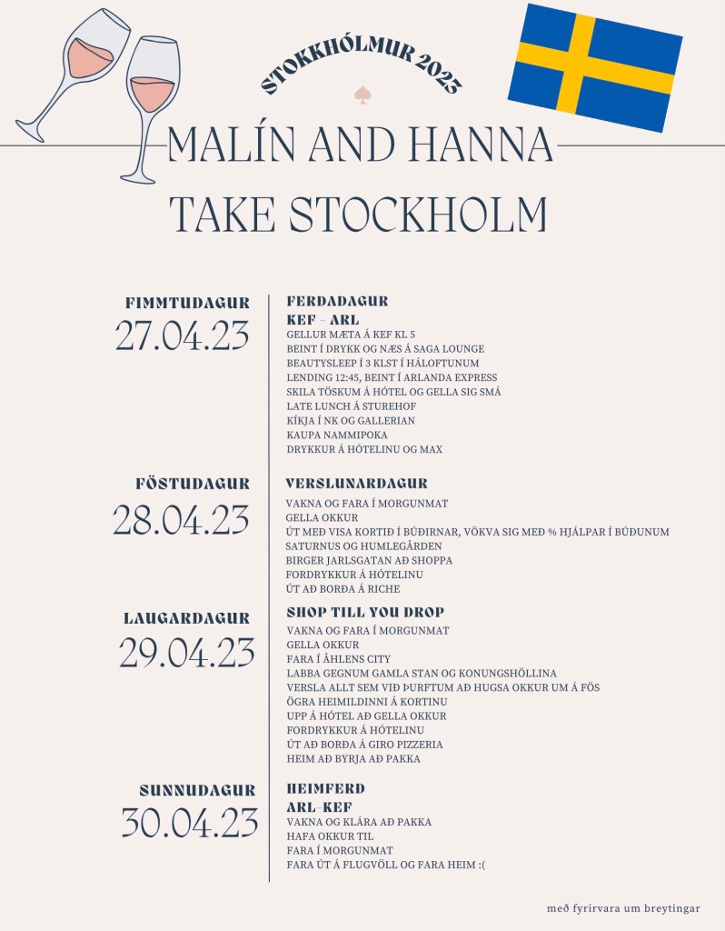 Við vorum með þétta dagskrá sem ég bjó til til þess að nýta dagana mjög vel. Ég ætla að deila dagskránni okkar hérna (neðst í færslunni) en auðvitað hliðraðist eitthvað til eins og bara gerist og eitthvað datt út og annað bættist við. Við fórum tvisvar út að borða, fyrst á Riche, þar er eiginlega möst að panta sér sænskar kjötbollur ef þið spurjið mig. Síðan fórum við á stað sem heitir Giro Pizzeria og hann er líka alveg truflaður! Kokteilarnir voru mjög góðir og pizzurnar enn betri. Ég var búin að sjá að staðurinn hefði fengið einhver verðlaun svo ég ákvað að prófa hann, hafði ekki farið á hann áður og varð ekki fyrir vonbrigðum.
